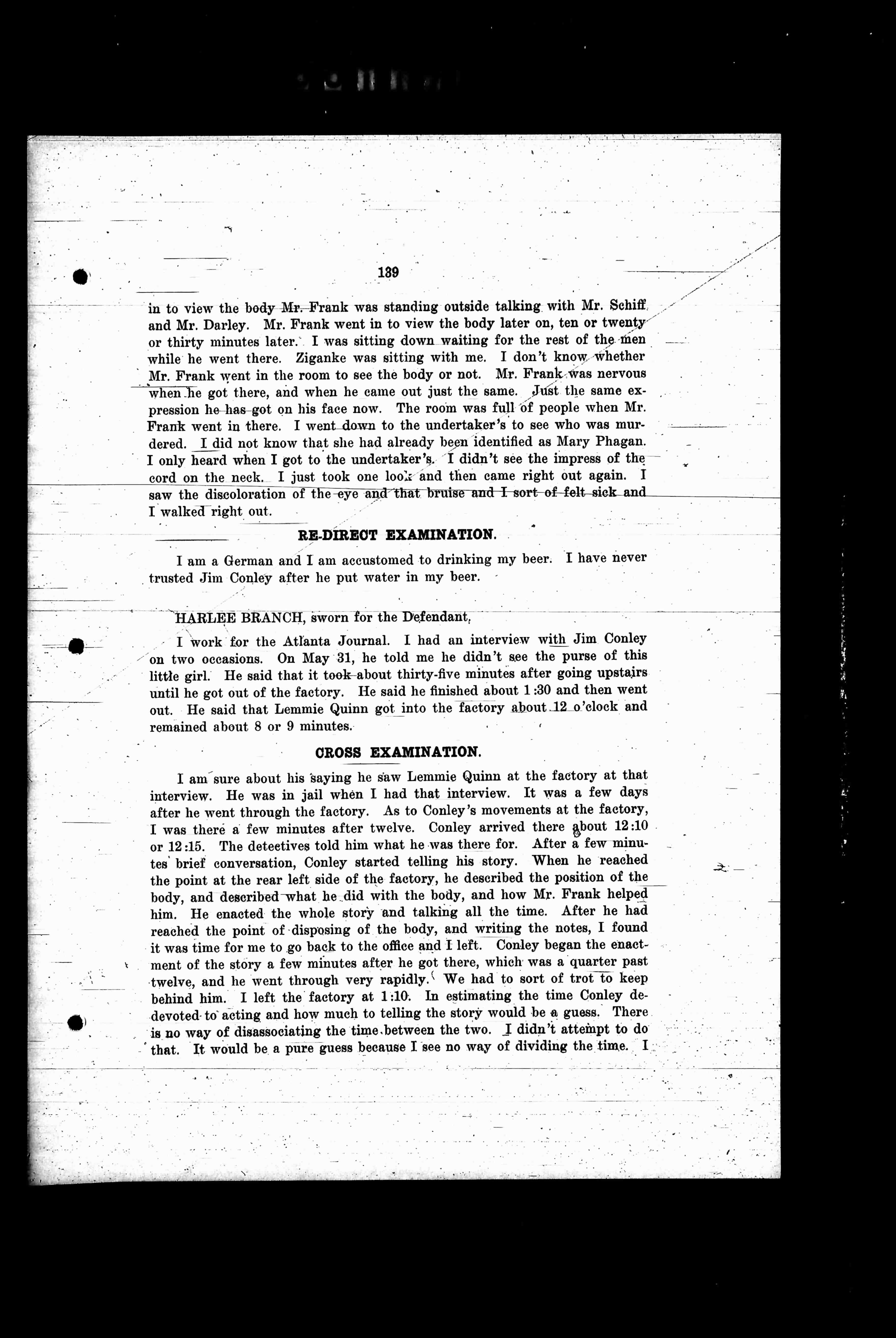 I am sure about his saying he saw Lemmie Quinn at the factory at that interview. He was in jail when I had that interview. It was a few days after he went through the factory. As to Conley's accounts of the factory, I was there a few minutes after twelve. Conley arrived there about 12:10 or 12:15. The detectives told him what he was there for. After a few minutes brief conversation, Conley started telling his story. When he reached the point at the rear left side of the factory, he described the position of the body, and described what he did with the body, and how Mr. Frank helped him. He enacted the whole story and talking all the time. After he had reached the point of disposing of the body, and writing the notes, I found it was time for me to go back to the office and left. Conley began the enactment of the story a few minutes after he got there, which was a quarter past twelve, and he went through very rapidly. We had to sort of trot to keep behind him. I left the factory at 1:10. In estimating the time Conley devoted to acting and how much to telling the story would be a guess. There is no way of disassociating the time between the two. I didn't attempt to do that. It would be a pure guess because I see no way of dividing the time. I