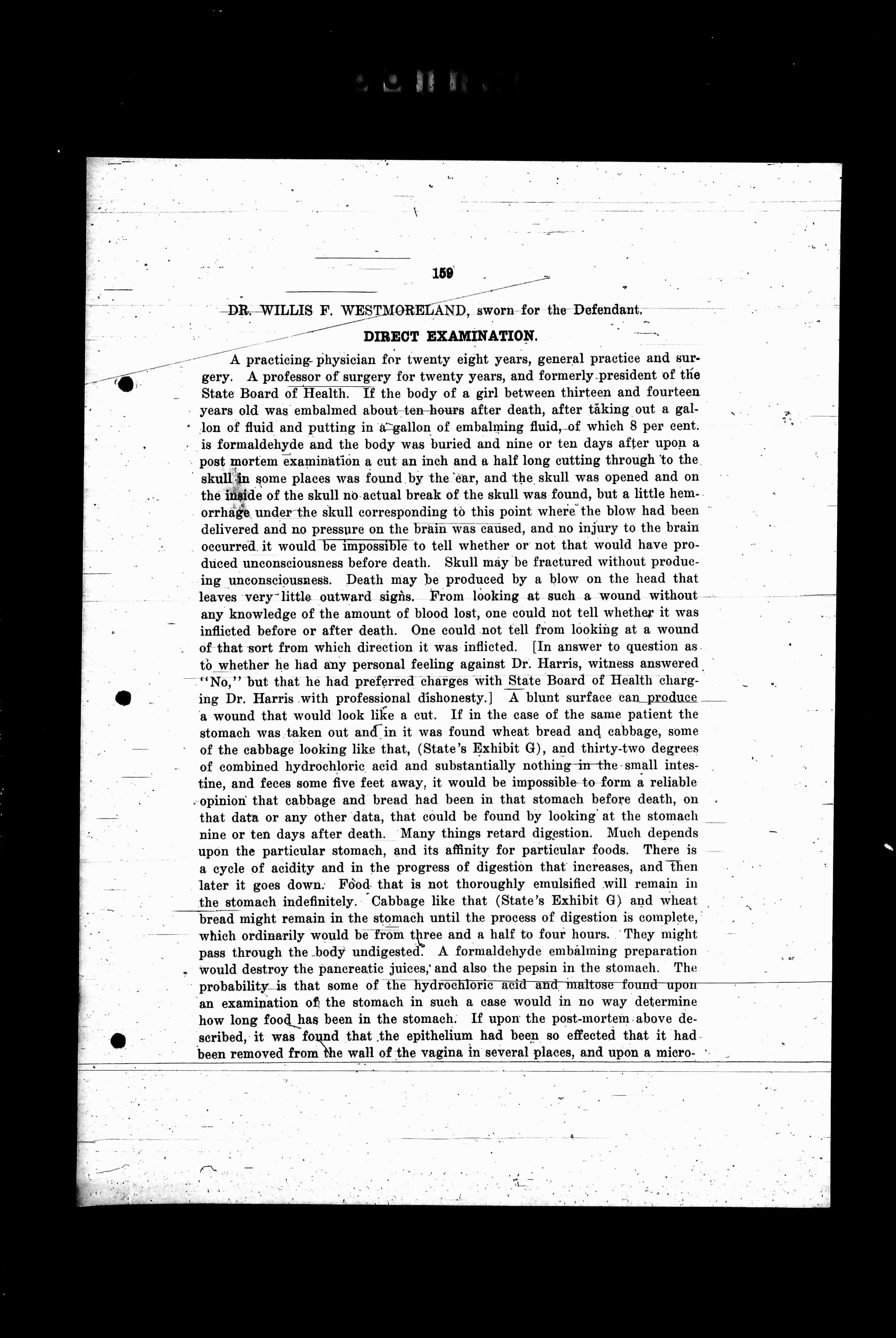 A practicing physician for twenty eight years, general practice and surgery. A professor of surgery for twenty one, and formerly president of the State Board of Health. If the body of a girl between thirteen and fourteen years old was embalmed about ten hours after death, after taking out a gallon of fluid and putting in α-gallon of embalming fluid, of which 8 per cent. is formaldehyde and the body was buried and nine or ten days after upon a post mortem examination a cut an inch and a half long cutting through to the skull in some places was found by the ear, and the skull was opened and on the inside of the skull no actual break of the skull was found, but a little hemorrhage under the skull corresponding to this point where the blow had been delivered and no pressure on the brain was caused, and no injury to the brain occurred it would be impossible to tell whether or not that would have produced unconsciousness before death. Skull may be fractured without producing unconsciousness. Death may be produced by a blow on the head that leaves very little outward signs. From looking at such a wound without any knowledge of the amount of blood lost, one could not tell whether it was inflicted before or after death. One could not tell from looking at a wound of that sort from which direction it was inflicted. [In answer to question as to whether he had any personal feeling against Dr. Harris, witness answered "No," but that he had preferred charges with State Board of Health charging Dr. Harris with professional dishonesty.] A blunt surface can produce a wound that would look like a cut. If in the case of the same patient the stomach was taken out and in it was found wheat bread and cabbage, some of the cabbage looking like that, (State's Exhibit G), and thirty-two degrees of combined hydrochloric acid and substantially nothing in the small intestine, and feces some five feet away, it would be impossible to form a reliable opinion that cabbage and bread had been eaten by stomach before death, on that data or any other data, that could be found by looking at the stomach nine or ten days after death. Many things retard digestion. Much depends upon the particular stomach, and its affinity for particular foods. There is a cycle of acidity and in the progress of digestion that increases, and Then later it goes down. Food that is not thoroughly emulsified will remain in the stomach indefinitely. Cabbage like that (State's Exhibit G) and wheat bread might remain in the stomach until the process of digestion is complete, which ordinarily would be from three and a half to four hours. They might pass through the body undigested. The formaldehyde embalming preparation would destroy the pancreatic juices, and also the pepsin in the stomach. The probability is that some of the hydrochloric acid and maltase found upon an examination of the stomach in such a case would in no way determine how long food has been in the stomach. If upon the post-mortem above described, it was found that the epithelium had been so effected that it had been removed from the wall of the vagina in several places, and upon a micro-