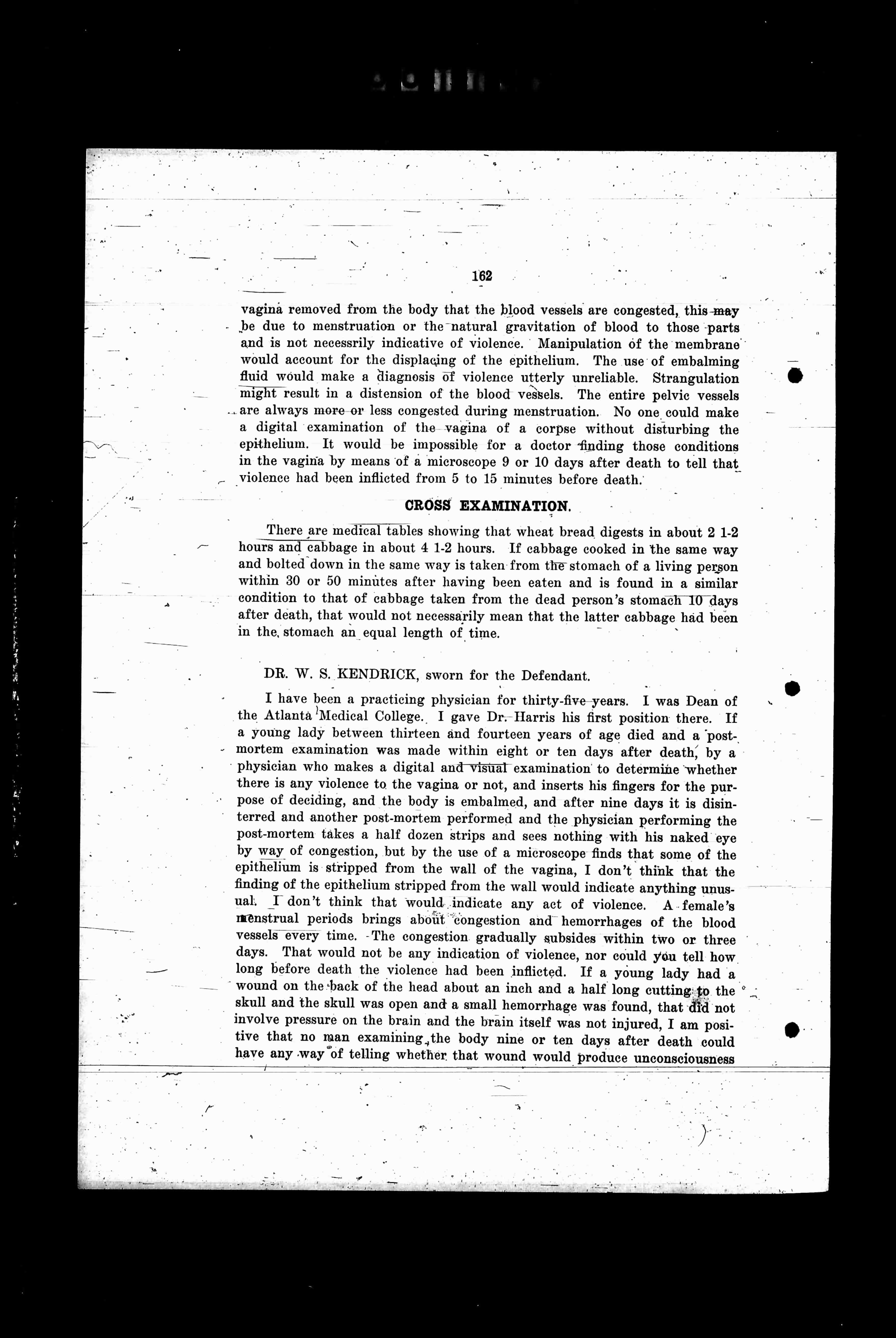 I have been a practicing physician for thirty-five years. I was Dean of the Atlanta Medical College. I gave Dr. Harris his first position there. If a young lady between thirteen and fourteen years of age died and a post-mortem examination was made within eight or ten days after death, by a physician who makes a digital and visual examination to determine whether there is any violence to the vagina or not, and inserts his fingers for the purpose of deciding, and the body is embalmed, and after nine days it is disinterred and another post-mortem performed, and the physician performing the post-mortem takes a half dozen stitches and sees nothing with his naked eye by way of congestion, but by the use of a microscope finds that some of the epithelium is stripped from the wall of the vagina, I don't think that the finding of the epithelium stripped from the wall would indicate anything unusual. I don't think that would indicate any act of violence. A female's menstrual periods brings about congestion and hemorrhages of the blood vessels every time. The congestion gradually subsides within two or three days. That would not be any indication of violence, nor could you tell how long before death the violence had been inflicted. If a young lady had a wound on the back of the head about an inch and a half long cutting to the skull and the skull was open and a small hemorrhage was found, that did not involve pressure on the brain and the brain itself was not injured, I am positive that no man examining the body nine or ten days after death could have any way of telling whether that wound would produce unconsciousness