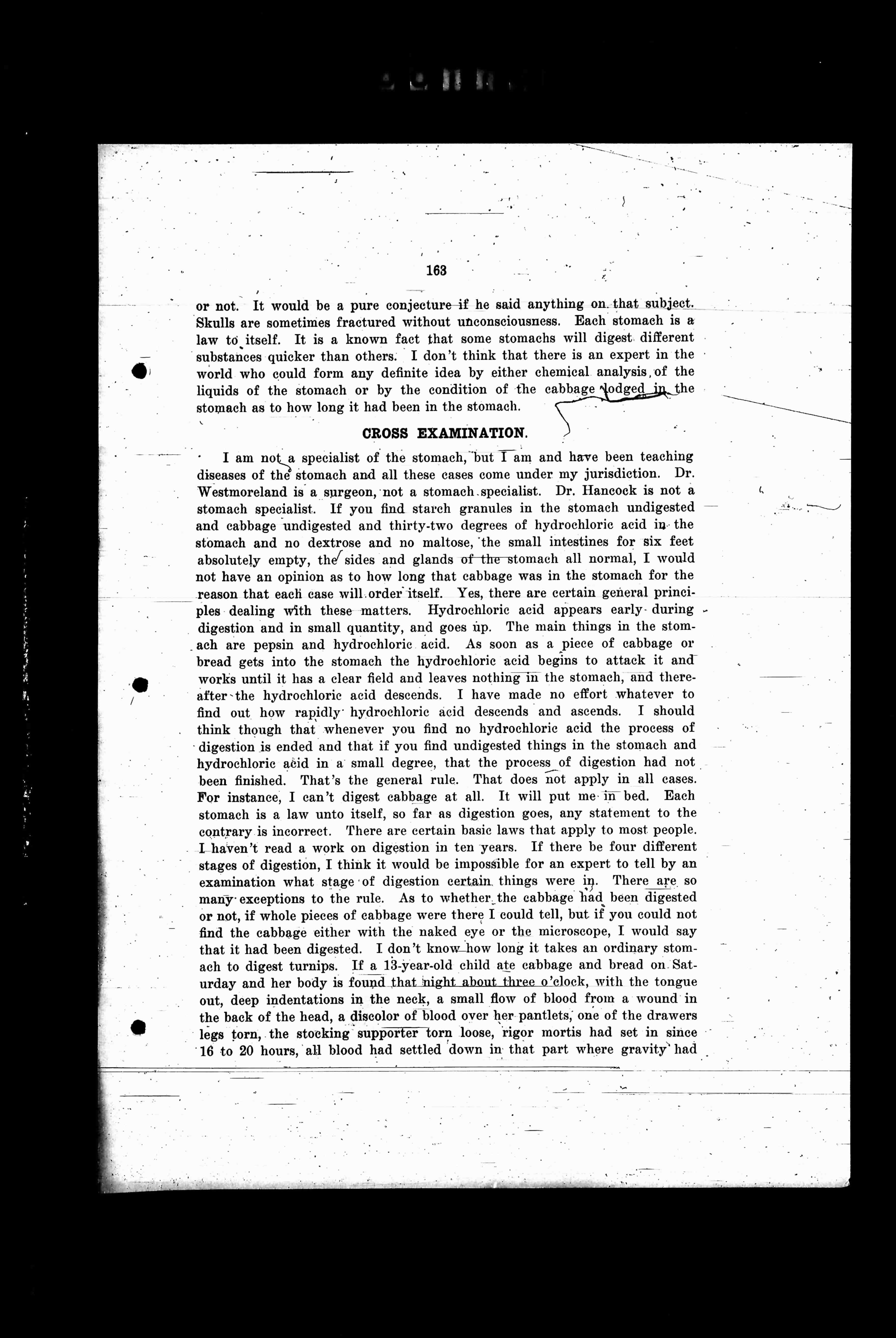 I am not a specialist of the stomach, but I am and have been teaching diseases of the stomach and all these cases come under my jurisdiction. Dr. Westmoreland is a surgeon, not a stomach specialist. Dr. Hancock is not a stomach specialist. If you find starch granules in the stomach undigested and cabbage undigested and thirty-two degrees of hydrochloric acid in the stomach and no dextrose and no maltose, the small intestines for six feet absolutely empty, the sides and glands of the stomach all normal, I would not have an opinion as to how long that cabbage was in the stomach for the reason that each case will order itself. Yes, there are certain general principles dealing with these matters. Hydrochloric acid appears early during digestion and in small quantity, and goes up. The main things in the stomach are pepsin and hydrochloric acid. As soon as a piece of cabbage or bread gets into the stomach the hydrochloric acid begins to attack it and works until it has a clear field and leaves nothing in the stomach, and thereafter the hydrochloric acid descends. I have made no effort whatever to find out how rapidly hydrochloric acid descends and ascends. I should think though that whenever you find no hydrochloric acid the process of digestion is ended and that if you find undigested things in the stomach and hydrochloric acid in a small degree, that the process of digestion had not been finished. That’s the general rule. That does not apply in all cases. For instance, I can’t digest cabbage at all, but it will put me in bed. Each stomach is a law unto itself, so far as digestion goes, any statement to the contrary is incorrect. There are certain laws that apply to most people. I haven’t read a work on digestion in ten years. If there be four different stages of digestion, I think it would be impossible for an expert to tell by an examination what stage of digestion certain things were in. There are so many exceptions to the rule. As to whether the cabbage had been digested or not, if whole pieces of cabbage were there I could tell, but if you could not find the cabbage either with the naked eye or the microscope, I would say that it had been digested. I don’t know how long it takes an ordinary stomach to digest turnips. If a 13-year-old child ate cabbage and bread on Saturday and her body is found that night about three o’clock, with the tongue out, deep indentations in the neck, a small flow of blood from a wound in the back of the head, a discoloration of blood over her pantlets, one of the drawers legs torn, the stocking supporter torn loose, rigor mortis had set in since 16 to 20 hours, all blood had settled down in that part where gravity had