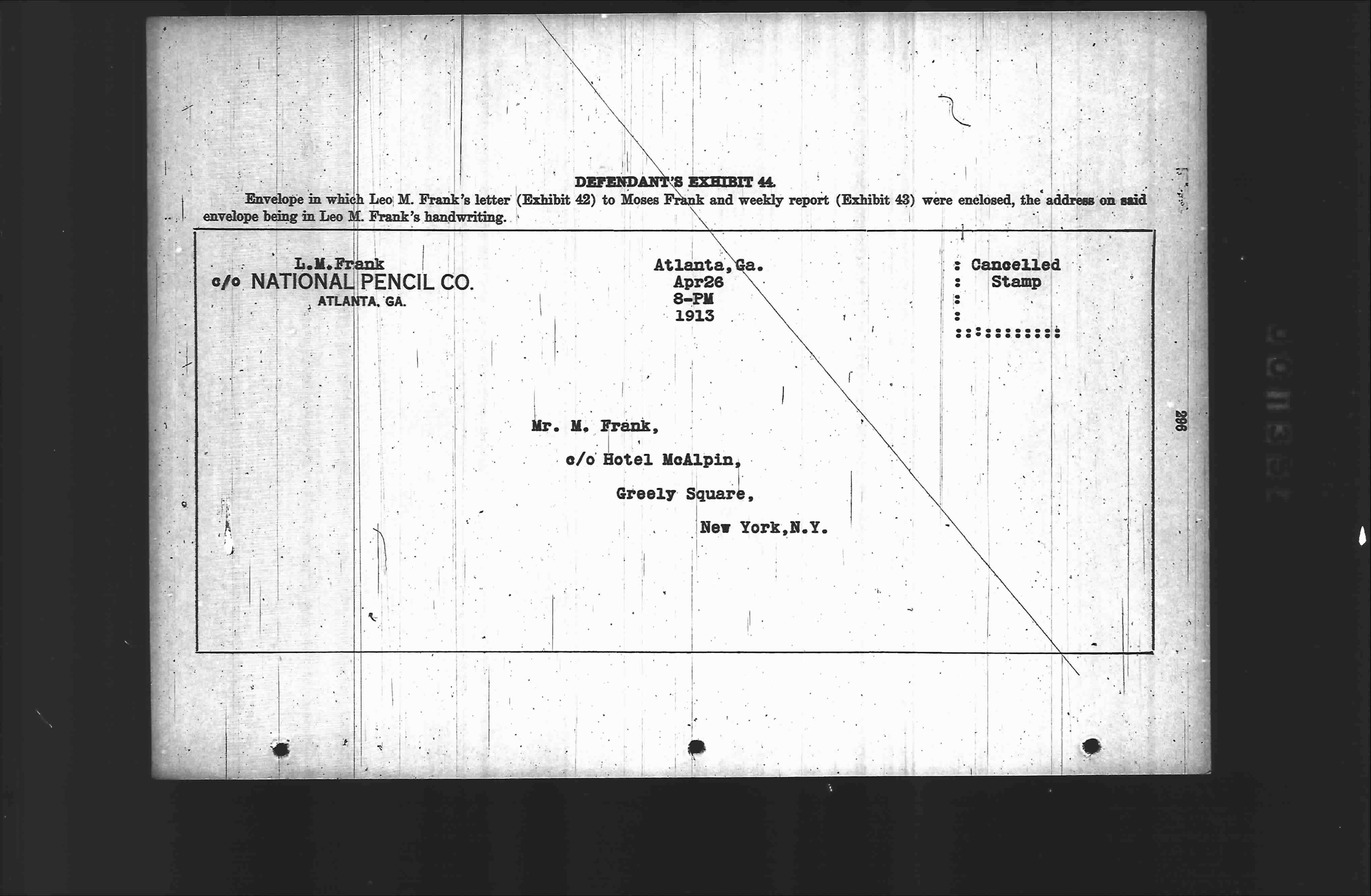 Envelope in which Leo M. Frank's letter (Exhibit 42) to Moses Frank and weekly report (Exhibit 43) were enclosed, the address on said envelope being in Leo M. Frank's handwriting.