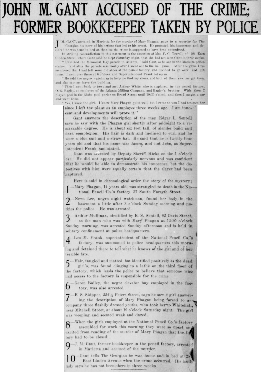 9—J. M. Gantt, former bookkeeper in the pencil factory, arrested in Marietta and accused of the murder.
