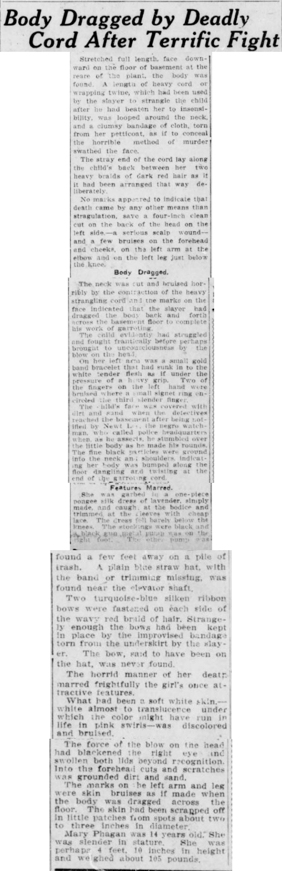 Stretched full length, face downward on the floor of the basement at the rear of the plant, the body was found. A length of heavy cord or wrapping twine, which had been used by the slayer to strangle the child after he had beaten her to insensibility, was looped around the neck, and a clumsy bandage of cloth, torn from her petticoat, as if to conceal the horrible method of murder swathed the face.