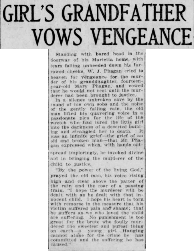 Standing with bared head in the doorway of his Marietta home, with tears falling unheeded down his furrowed cheeks, W. J. Phagan cried to heaven for vengeance for the murder of his granddaughter, fourteen-year-old Mary Phagan, and vowed that he would not rest until the murderer had been brought to justice.