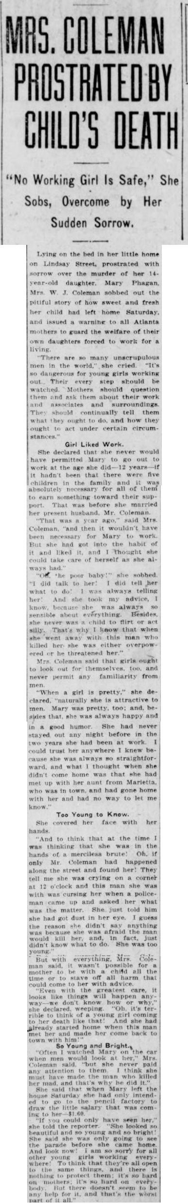 Lying on the bed in her little home on Lindsay Street, prostrated with sorrow over the murder of her 14-year-old daughter, Mary Phagan, Mrs. W. J. Coleman sobbed out the pitiful story of how sweet and fresh her child had left home Saturday, and issued a warning to all Atlanta mothers to guard the welfare of their own daughters forced to work for a living.