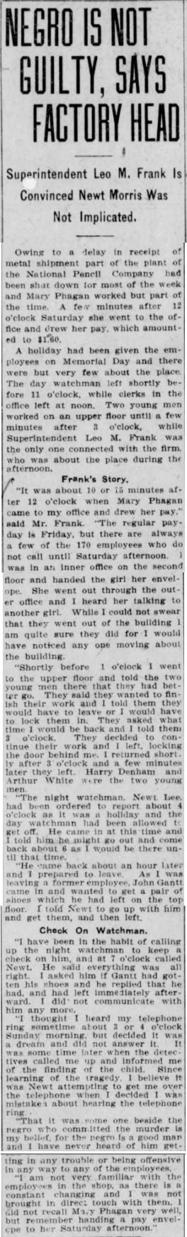 "It was about 10 or 15 minutes after 12 o'clock when Mary Phagan came to my office and drew her pay," said Mr. Frank. "The regular pay-day is Friday, but there are always a few of the 170 employees who do not call until Saturday afternoon. I was in an inner office on the second floor and handed the girl her envelope. She went out through the outer office and I heard her talking to another girl. While I could not swear that they went out of the building I am quite sure they did for I would have noticed any one moving about the building.