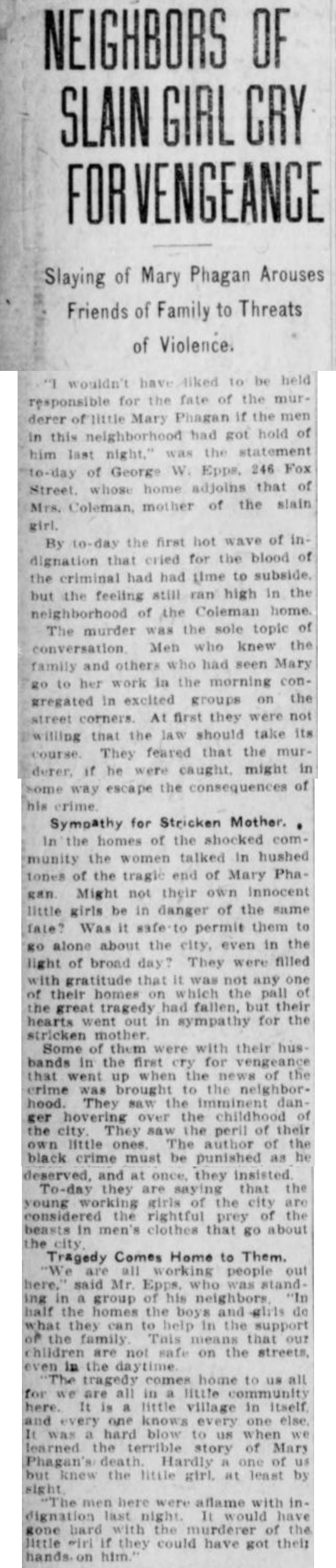 "I wouldn't have liked to be held responsible for the fate of the murderer of little Mary Phagan if the men in this neighborhood had got hold of him last night," was the statement to-day of George W. Epps, 246 Fox Street, whose home adjoins that of Mrs. Coleman, mother of the slain girl.
