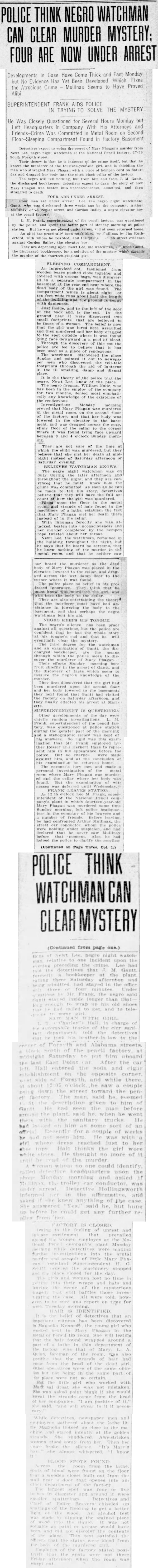 The third degree for the watchman and an examination of Gantt, the discharged bookkeeper, are the means through which the police mean to discover the murderer of Mary Phagan.