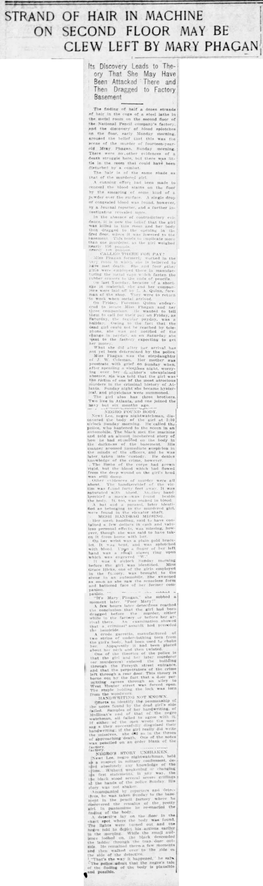 A few hours later detectives reached the conclusion that the girl had been dragged before the murder, either while in the factory or before her arrival there. An examination showed that a criminal assault had preceded the homicide.