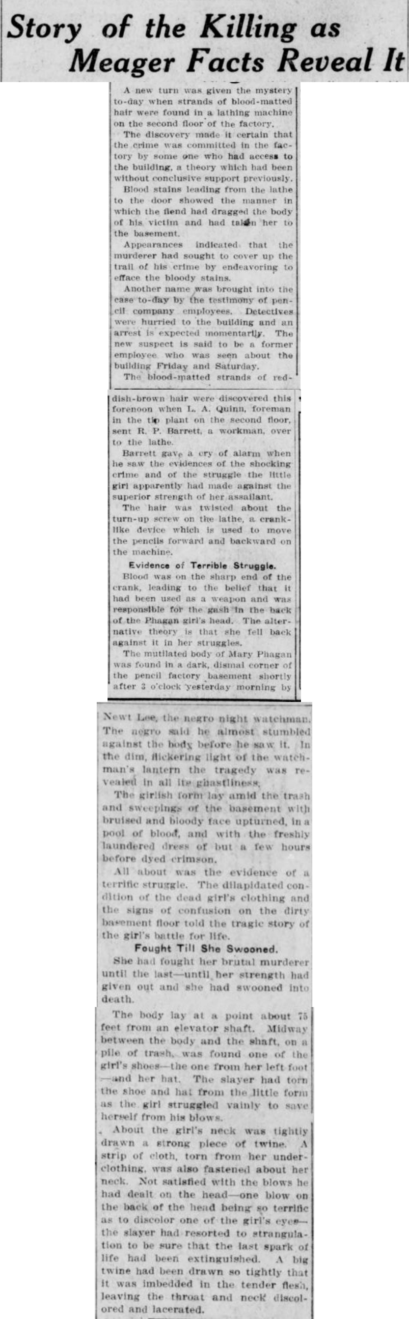 The mutilated body of Mary Phagan was found in a dark, dismal corner of the pencil factory basement shortly after 3 o'clock yesterday morning by Newt Lee, the negro night watchman. The negro said he almost stumbled against the body before he saw it. In the dim, flickering light of the watchman's lantern the tragedy was revealed in all its ghastliness.