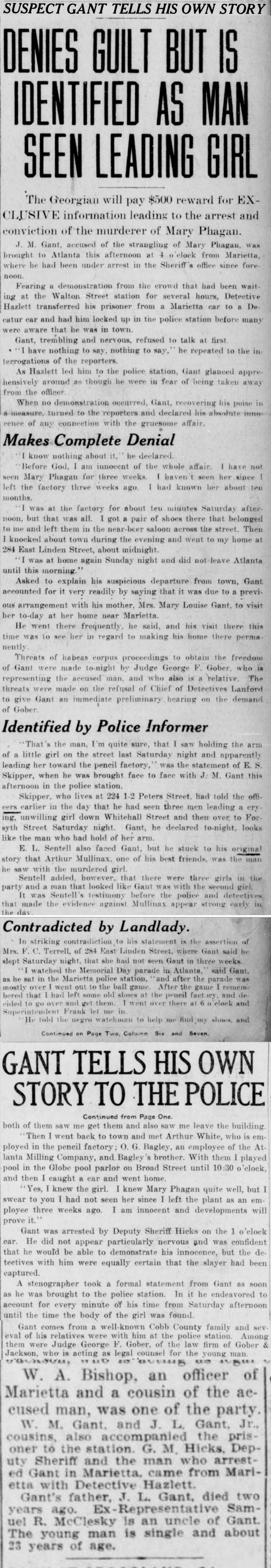 J. M. Gantt, accused of the strangling of Mary Phagan, was brought to Atlanta this afternoon at 4 o'clock from Marietta, where he had been under arrest in the Sheriff's office since forenoon.
