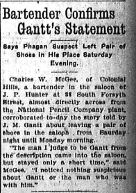 Charles W. McGee, of Colonial Hills, a bartender in the saloon of J. P. Hunter at 35 South Forsyth Street, almost directly across from the National Pencil Company plant, corroborated to-day the story told by J. M. Gantt about leaving a pair of shoes in the saloon from Saturday night until Monday morning.