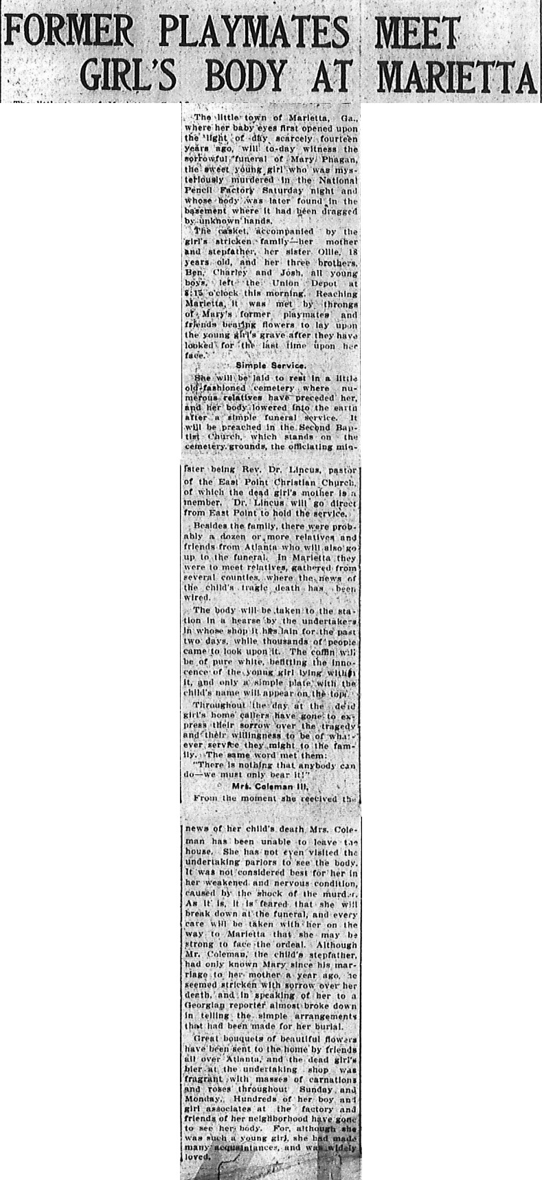 From the moment she received the news of her child's death, Mrs. Coleman has been unable to leave the house. She has not even visited the undertaking pariors to see the body. It was not considered best for her in her weakened and nervous condition, caused by the shock of the murder. As it is, it is feared that she will break down at the funeral, and every care will be taken with her on the way to Marietta that she may be strong to face the ordeal. Although Mr. Coleman, the child's stepfather, had only known Mary since his marriage to her mother a year ago, he seemed stricken with sorrow over her death, and in speaking of her to a Georgian reporter almost broke down in telling the simple arrangements that had been made for her burial.