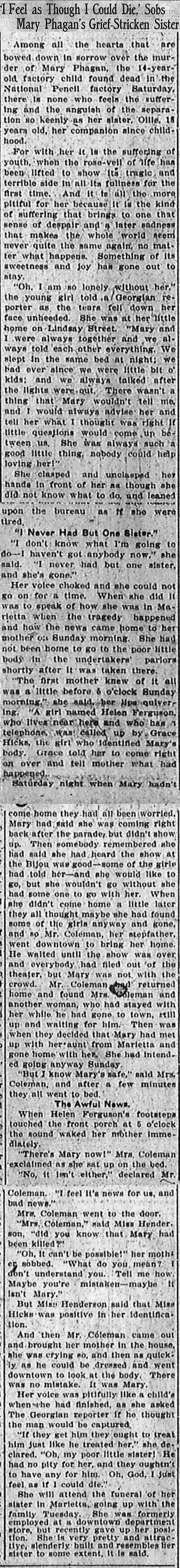 Among all the hearts that are bowed down in sorrow over the murder of Mary Phagan, the 14-year-old factory child found dead in the National Pencil factory Saturday, there is none who feels the suffering and the anguish of the separation so keenly as her sister, Ollie, 18 years old, her companion since childhood.