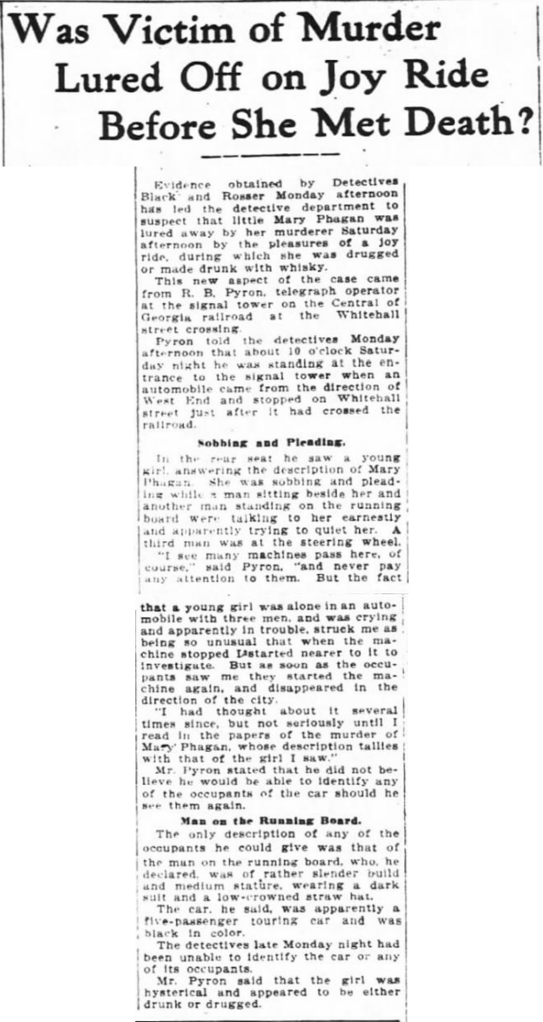 Evidence obtained by Detectives Black and Rosser Monday afternoon has led the detective department to suspect that little Mary Phagan was lured away by her murderer Saturday afternoon by the pleasures of a joy ride during which she was drugged or made drunk with whisky.