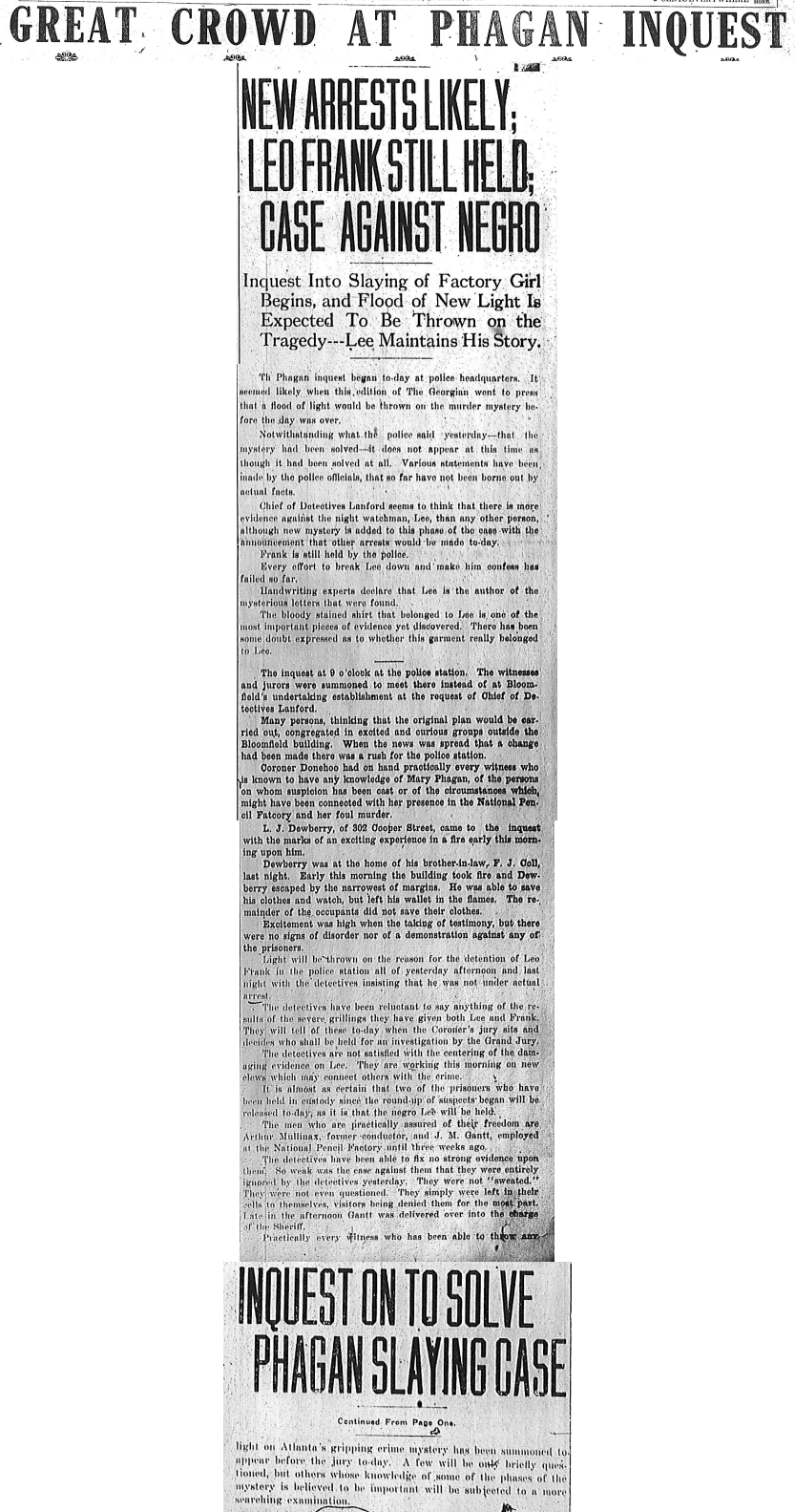 The Phagan inquest began to-day at police headquarters. It seemed likely when this edition of The Georgian went to press that a flood of light would be thrown on the murder mystery before the day was over.