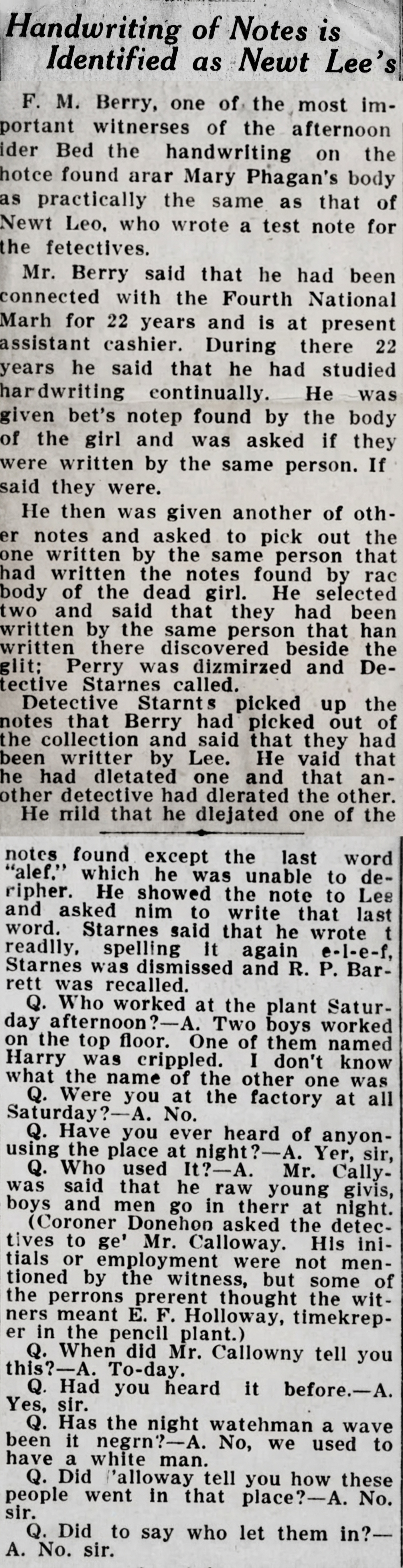 F. M. Berry, one of the most important witnesses of the afternoon, identified the handwriting on the notes found near Mary Phagan's body as practically the same as that of Newt Lee, who wrote a test note for the detectives.