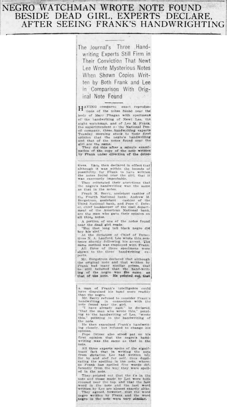- 0014 Tuesday, 29th April 1913 Three Handwriting Experts Say Negro Wrote the Two Notes Found by Body of Girl, The Atlanta Journal [Last Updated On: December 17th, 2023] [Originally Added On: December 1st, 2023]