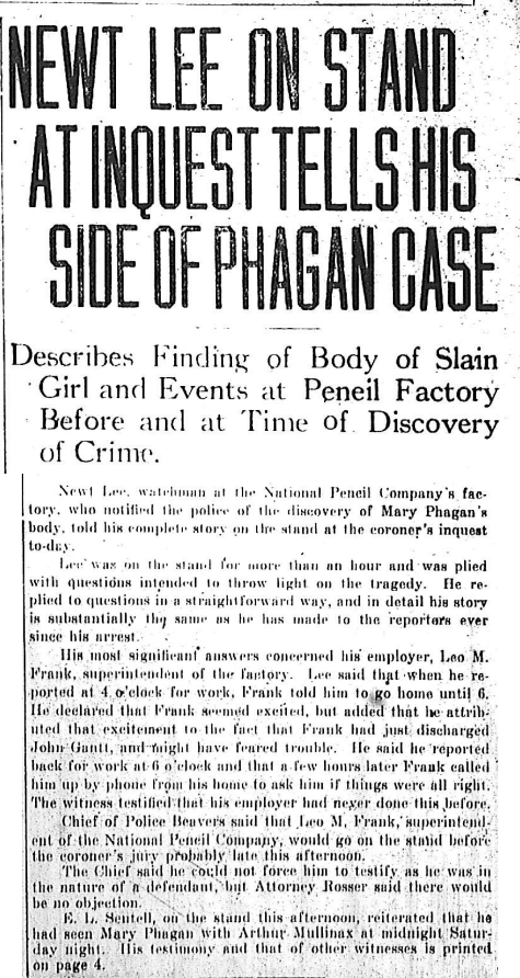 Newt Lee, watchman at the National Pencil Company's factory, who notified the police of the discovery of Mary Phagan's body, told his complete story on the stand at the coroner's inquest to-day.