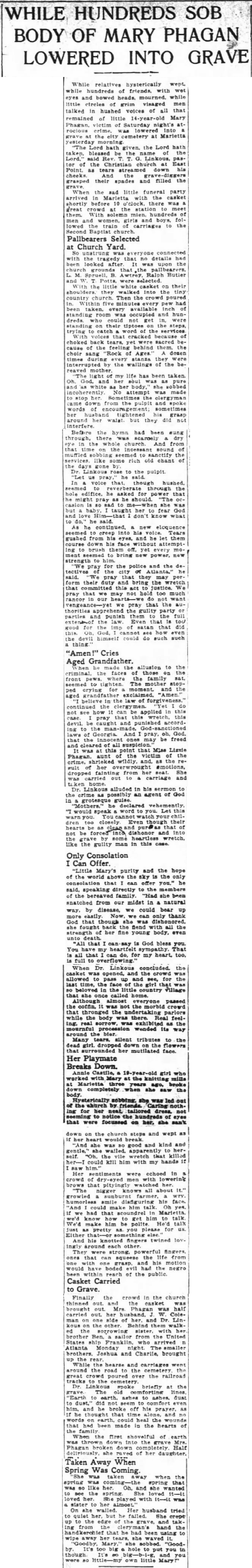 While relatives hysterically wept, while hundreds of friends, with wet eyes and bowed heads, mourned, while little circles of grim visage men talked in hushed voices of all that remained of little 14-year-old Mary Phagan, victim of Saturday night's atrocious crime, was lowered into a grave at the city cemetery at Marietta yesterday morning.