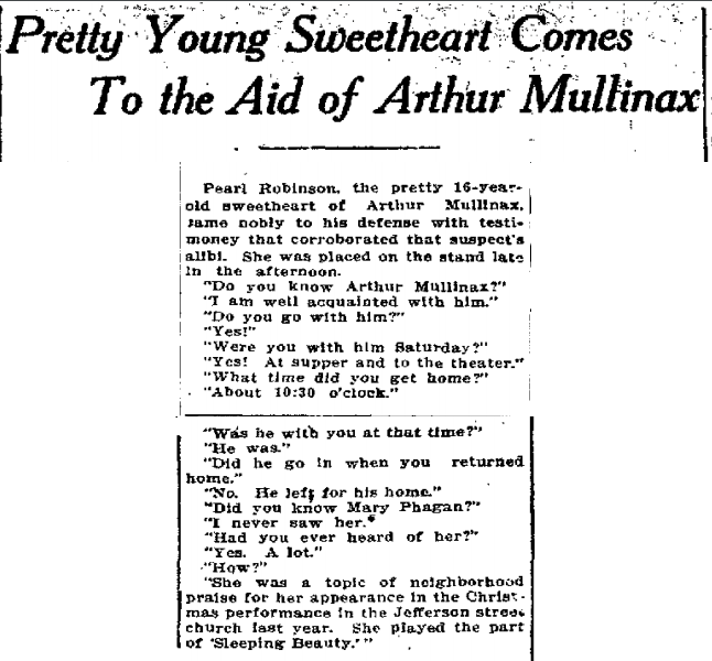 Pearl Robison, the pretty 16-year-old sweetheart of Arthur Mullinax, came nobly to his defense with testimony that corroborated that suspect's alibi. She was placed on the stand late in the afternoon.
