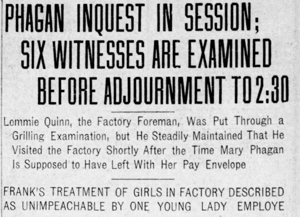 Lemmie A. Quinn was called to the stand. He lives at 31B Julliam street, he said, and is foreman of the metal department at the National Pencil factory. Mary Phagan worked in his department, he said. The last time he saw her was on the Monday preceding the murder, he said. She left the plant about 2 o'clock P.M. that Monday, said he. That was earlier than usual, but she left because the metal with which she worked had run out and she wanted to hurry to the matinee. He didn't know any of her intimate friends, said he. She worked with Helen Ferguson and Grace Hix and Magnolia Kennedy, said he, and Henry Smith and John Ramey also worked in that department.
