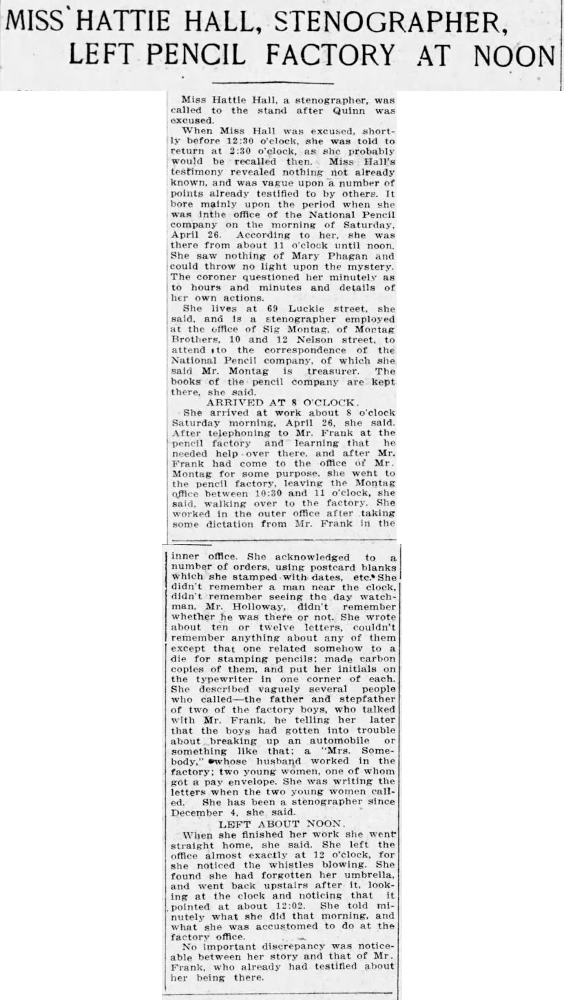 When Miss Hall was excused, shortly before 12:30 o'clock, she was told to return at 2:30 o'clock, as she probably would be recalled then. Miss Hall's testimony revealed nothing not already known, and was vague upon a number of points already testified to by others. It bore mainly upon the period when she was in the office of the National Pencil company on the morning of Saturday, April 26. According to her, she was there from about 11 o'clock until noon. She saw nothing of Mary Phagan and could throw no light upon the mystery. The coroner questioned her minutely as to hours and minutes and details of her own actions.