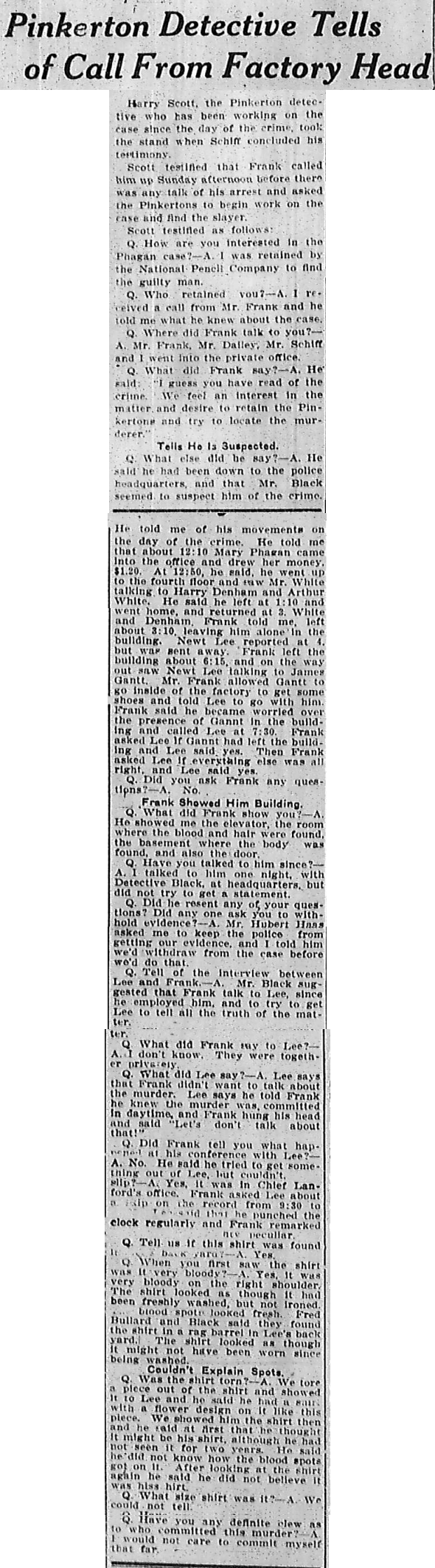 Scott testified that Frank called him up Sunday afternoon before there was any talk of his arrest and asked the Pinkertons to begin work on the case and find the slayer.