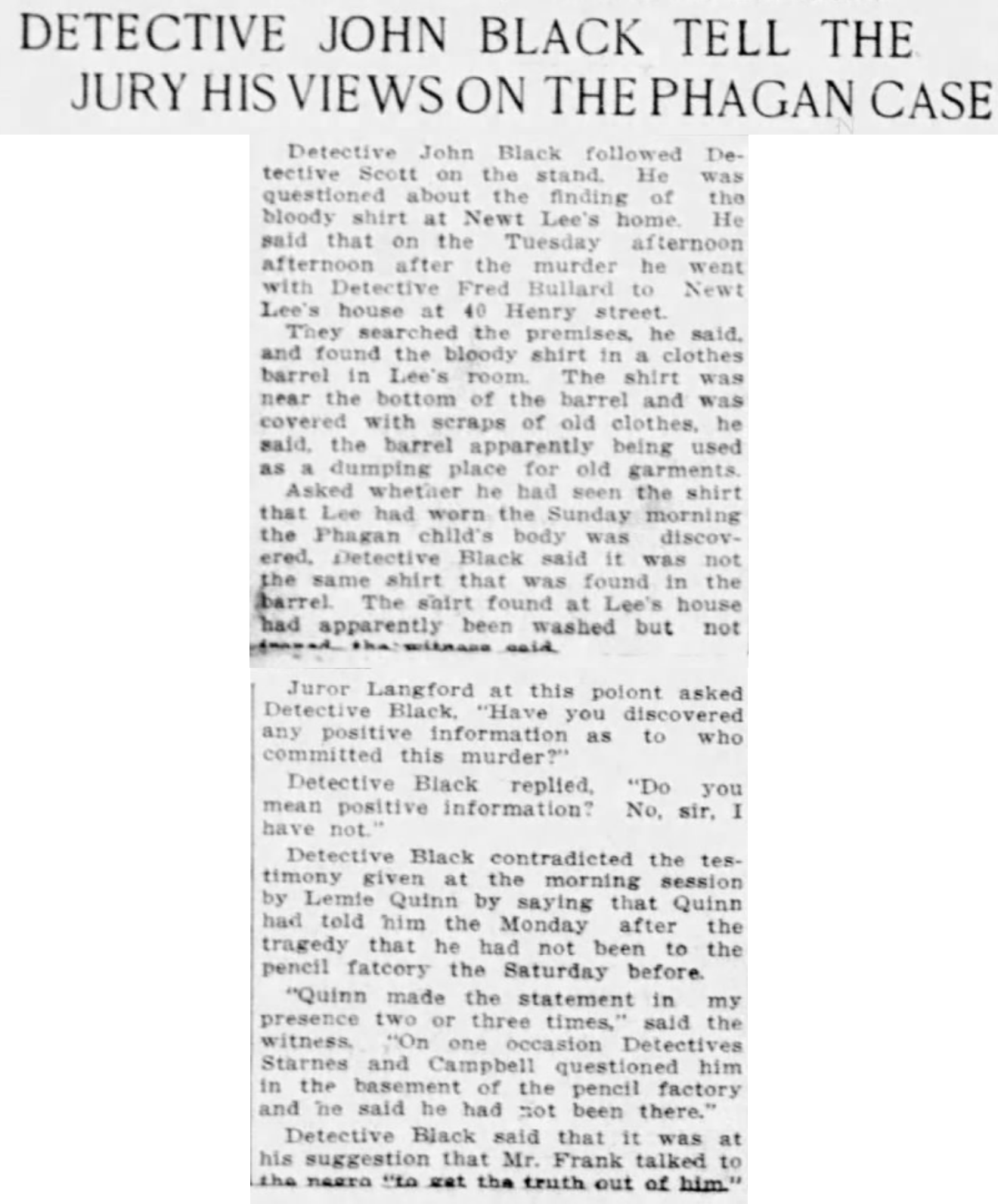 Detective John Black followed Detective Scott on the stand. He was questioned about the finding of the bloody shirt at Newt Lee's home. He said that on the Tuesday afternoon after the murder he went with Detective Fred Bullard to Newt Lee's house at 40 Henry street.