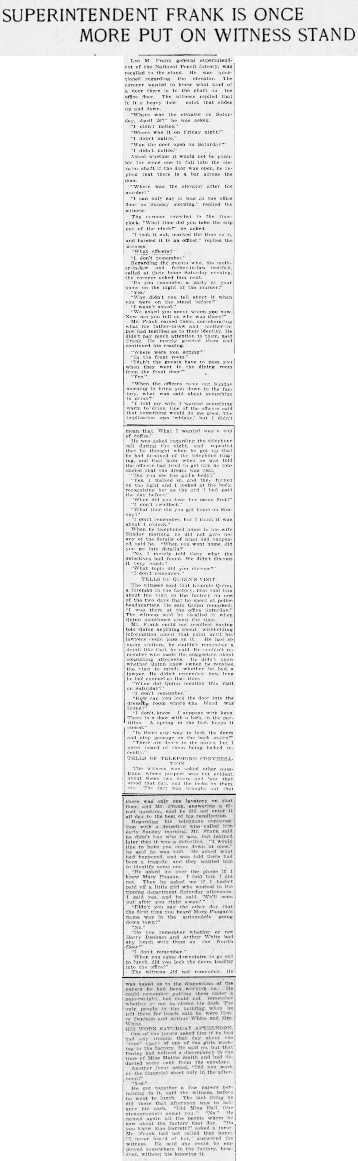 - 0031 Tuesday, 6th May 1913, Leo Max Frank’s Complete Story of Where He Was and What He Did on Day of Mary Phagan Murder, The Atlanta Journal [Last Updated On: December 19th, 2023] [Originally Added On: December 1st, 2023]