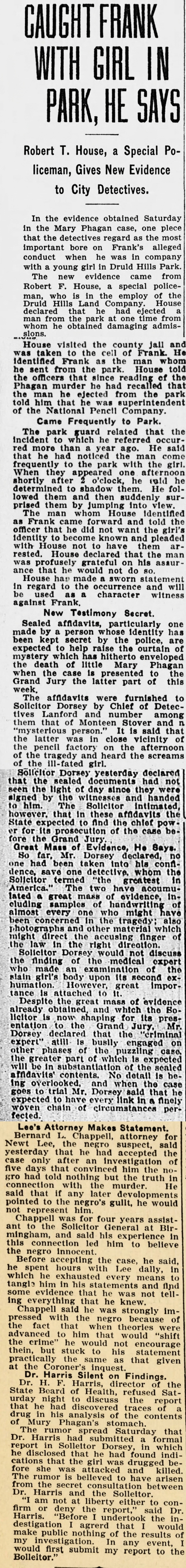 In the evidence obtained Saturday in the Mary Phagan case, one piece that the detectives regard as the most important bore on Frank's alleged conduct when he was in company with a young girl in Druid Hills Park.