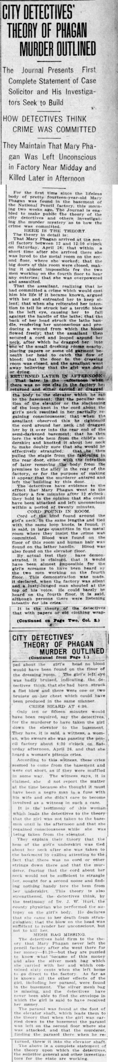 For the first time since the lifeless body of pretty fourteen-year-old Mary Phagan was found in the basement of the National Pencil factory, this morning two weeks ago, The Journal is enabled to make public the theory of the city detectives and others investigating the murder mystery as to how the crime was committed.