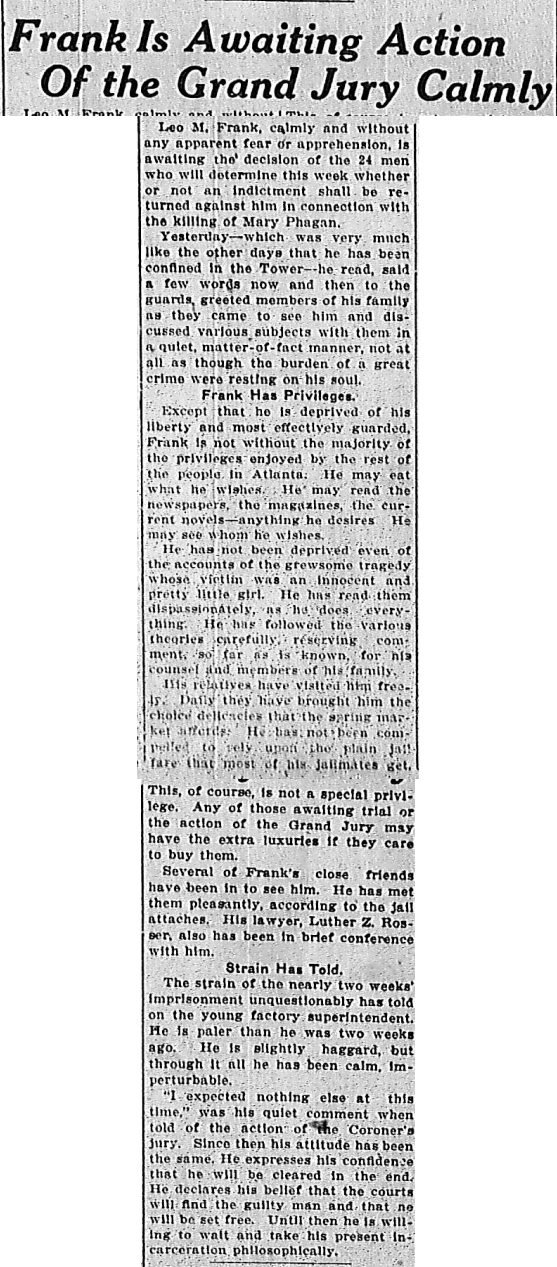 Leo M. Frank, calmly and without any apparent fear or apprehension, is awaiting the decision of the 24 men who will determine this week whether or not an indictment shall be returned against him in connection with the killing of Mary Phagan.