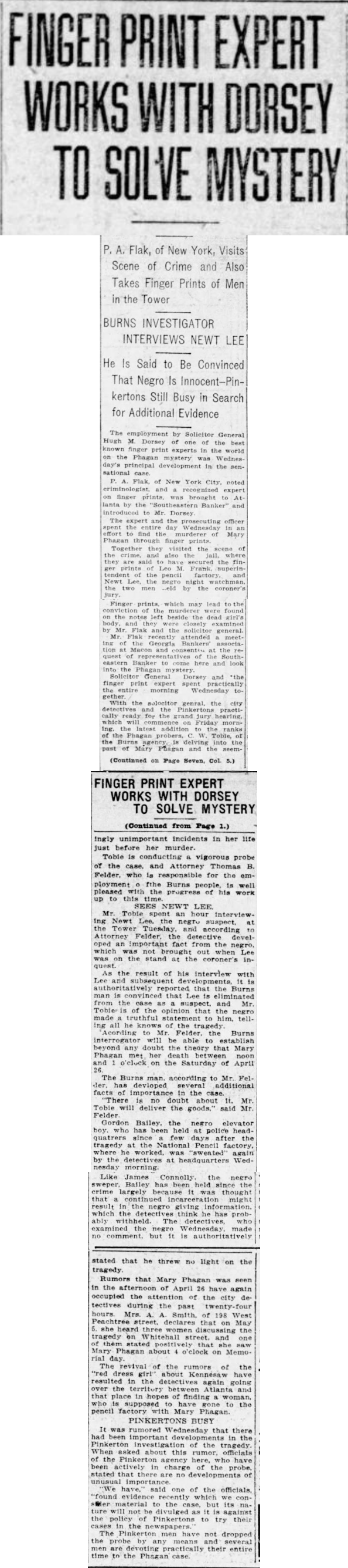 Mr. Flak recently attended a meeting of the Georgia Banker's association at Macon and consented at the request of representatives of the Southeastern Banker to come here and look into the Phagan mystery.