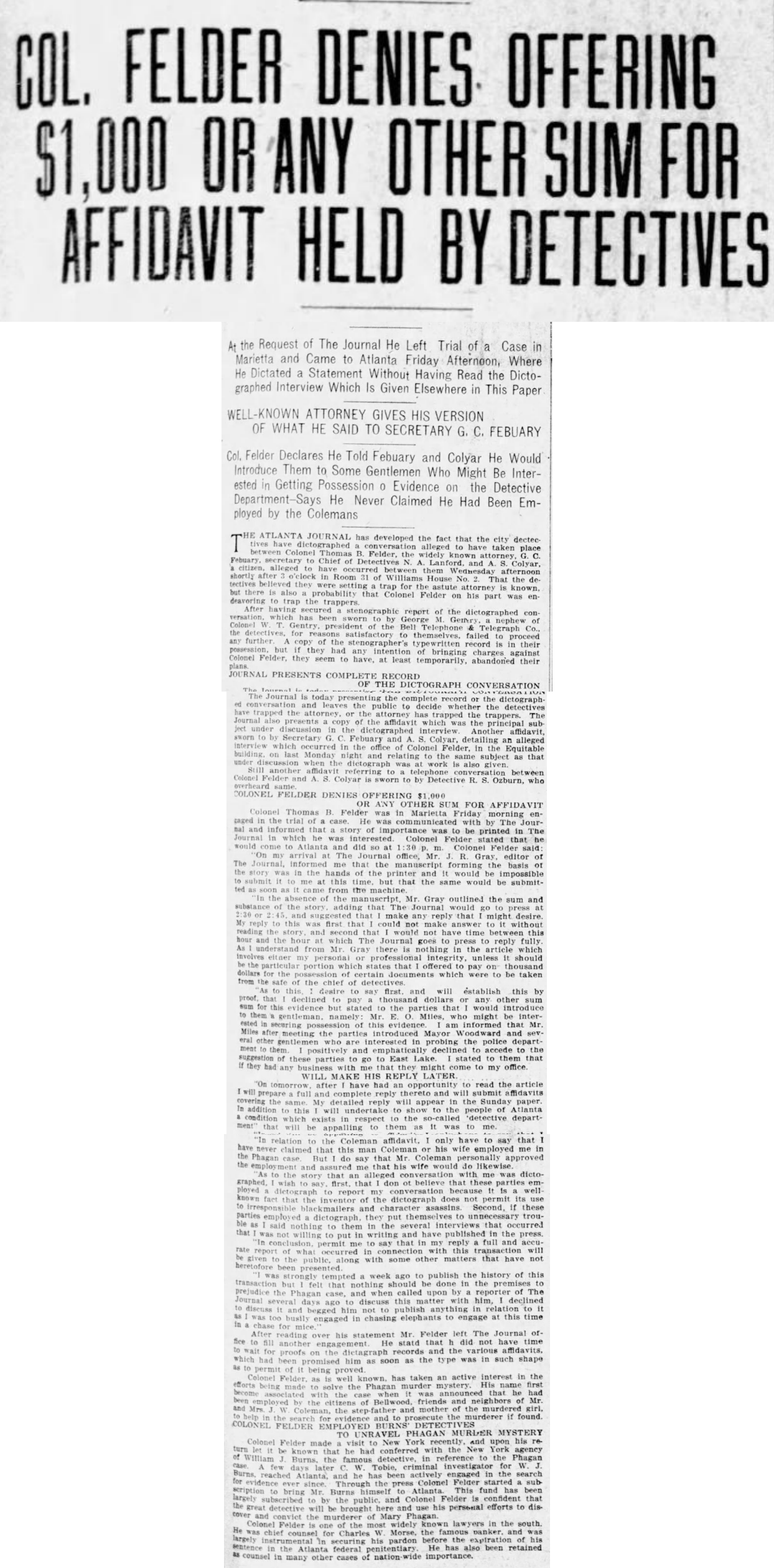 The Atlanta Journal has developed the fact that the city detectives have dictographed a conversation alleged to have taken place between Colonel Thomas B. Felder, the widely known attorney, G. C. Febuary, secretary to Chief of Detectives N. A. Lanford, and A. S. Colyar, a citizen, alleged to have occurred between them Wednesday afternoon shortly after 3 o'clock in Room 31 of Williams House No. 2. That the detectives believed they were setting a trap for the astute attorney is known, but there is also a probability that Colonel Felder on his part was endeavoring to trap the trappers.