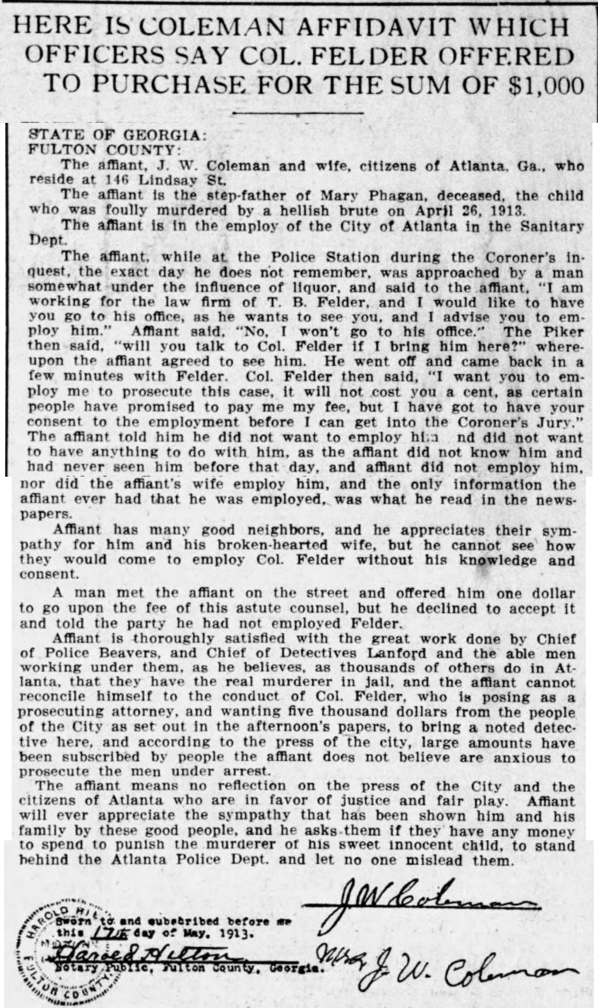 Affiant is thoroughly satisfied with the great work done by Chief of Police Beavers, and Chief of Detectives Lanford and the able men working under them, as he believes, as thousands of others do in Atlanta, that they have the real murderer in jail, and the affiant cannot reconcile himself to the conduct of Col. Felder, who is posing as a prosecuting attorney, and wanting five thousand dollars from the people of the City as set out in the afternoon's papers, to bring a noted detective here, and according to the press of the city, large amounts have been subscribed by people the affiant does not believe are anxious to prosecute the men under arrest.