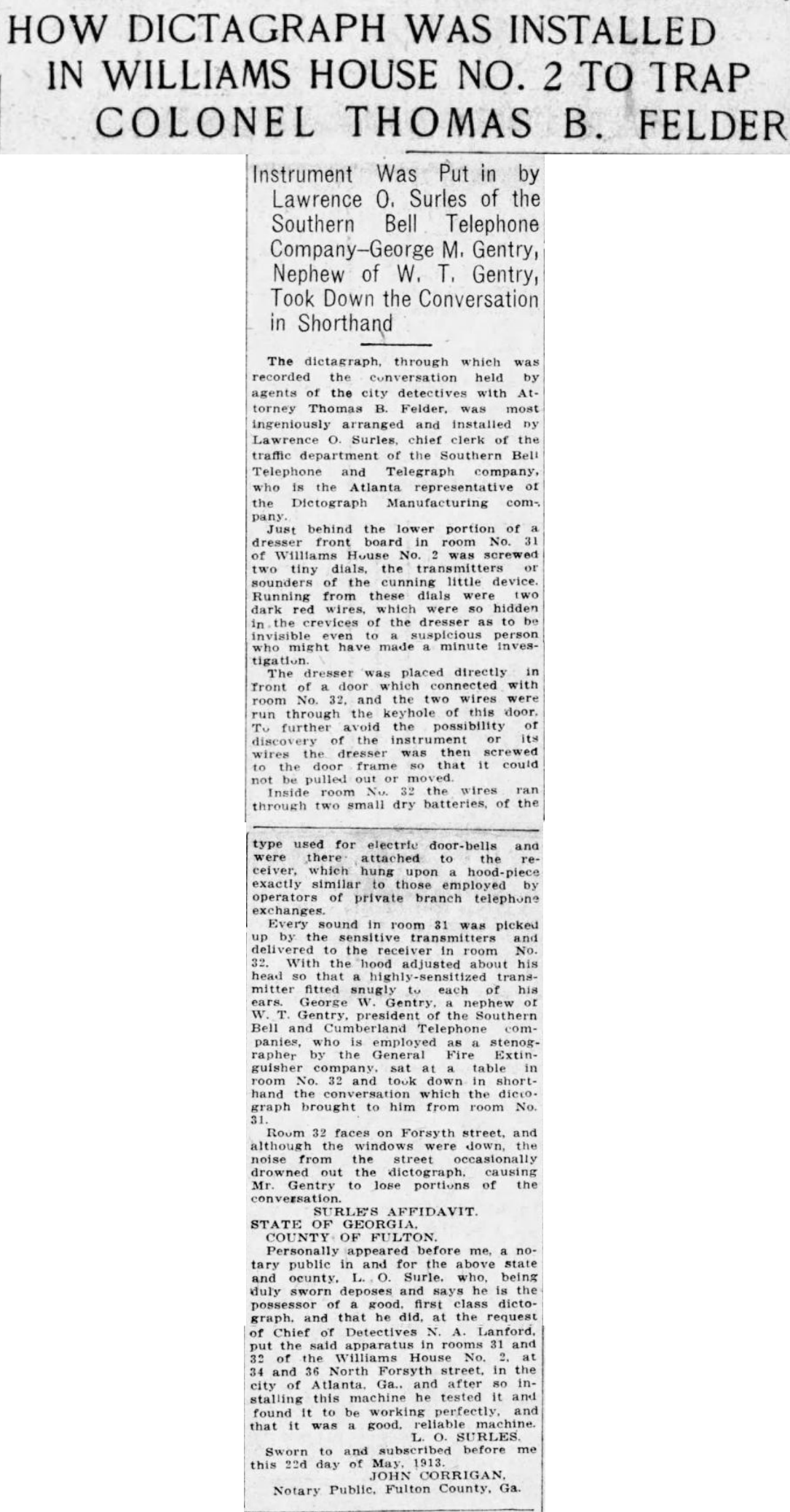 The dictograph, through which was recorded the conversation held by agents of the city detectives with Attorney Thomas B. Felder, was most ingeniously arranged and installed by Lawrence O. Surles, chief clerk of the traffic department of the Southern Bell Telephone and Telegraph company, who is the Atlanta representative of the Dictograph Manufacturing company.