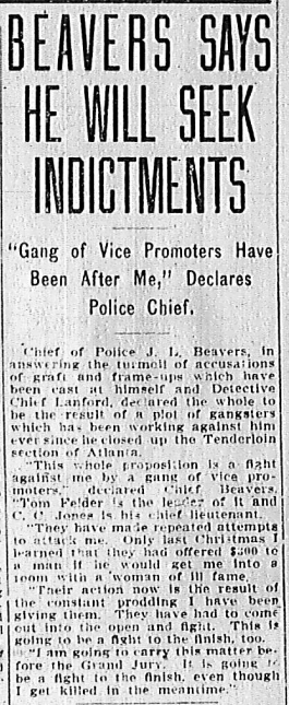 Chief of Police J. L. Beavers, in answering the turmoil of accusations of graft and frame-ups which have been cast at himself and Detective Chief Lanford, declared the whole to be the result of a plot of gangsters which has been working against him ever since he closed up the Tenderloin section of Atlanta.