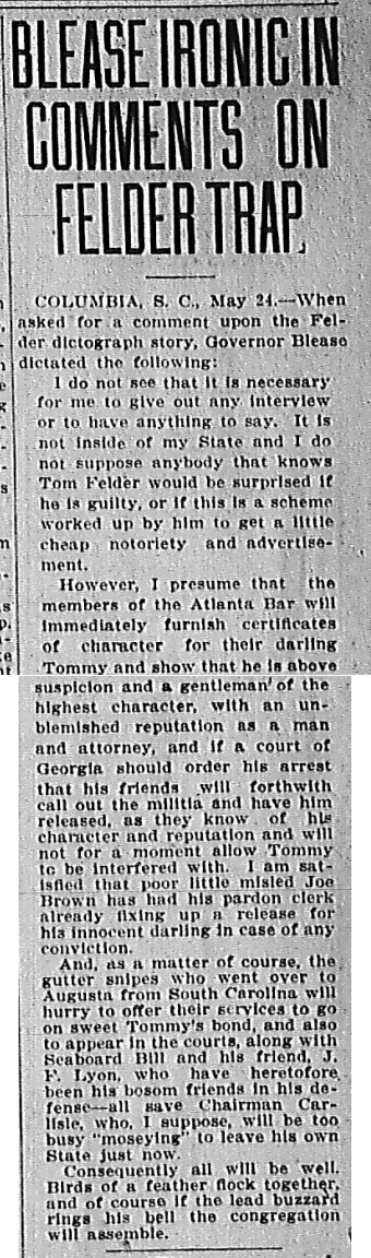 COLUMBIA, S. C., May 24.—When asked for a comment upon the Felder dictograph story, Governor Blease dictated the following:
