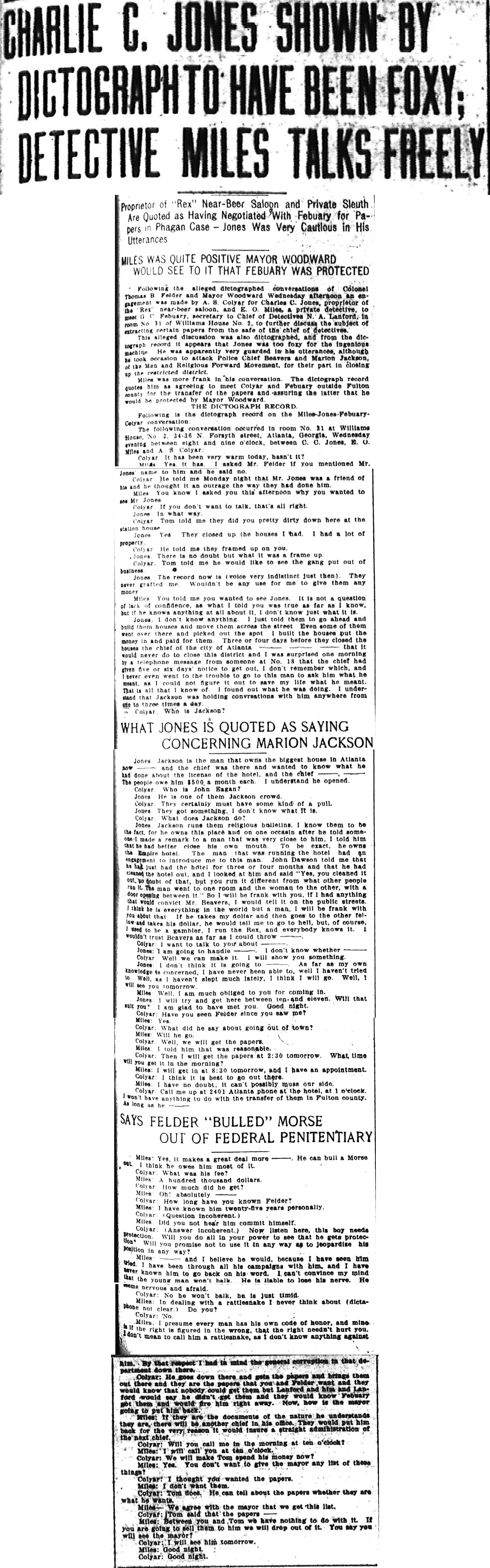 Following the alleged dictographed conversations of Colonel Thomas B. Felder and Mayor Woodward Wednesday afternoon an engagement was made by A. S. Colyar for Charles C. Jones, proprietor of the "Rex" near-beer saloon, and E. O. Miles, a private detective, to meet G. C. Febuary, secretary to Chief of Detectives N. A. Lanford, in room No. 31 of Williams House No.2, to further discuss the subject of extracting certain papers from the safe of the chief of detectives.