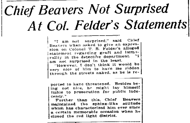 "I am not surprised," said Chief Beavers when asked to give an expression on Colonel T. B. Felder's alleged statement regarding graft and immorality in the detective department. "I am not surprised in the least.