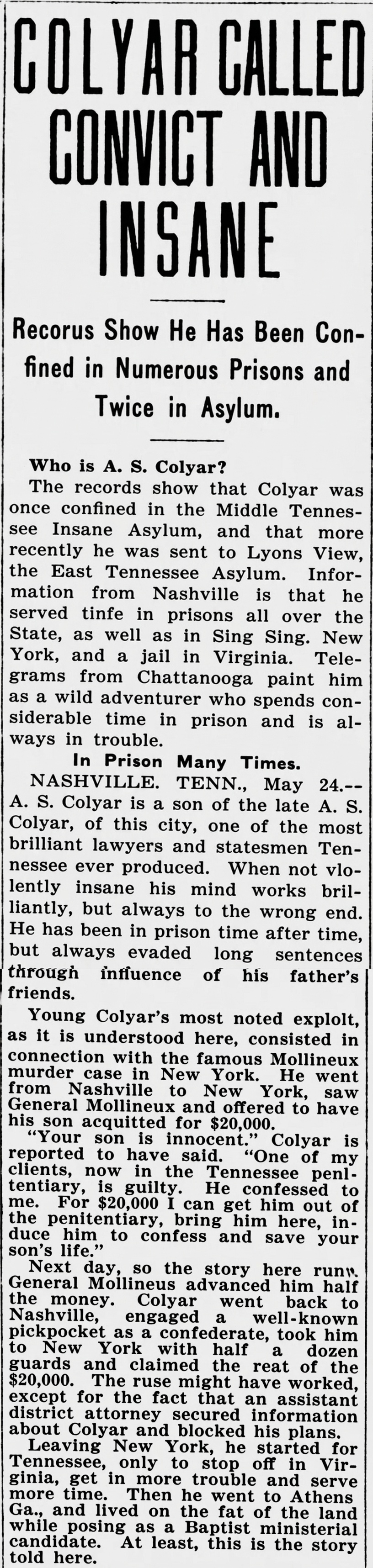 The records show that Colyar was once confined in the Middle Tennessee Insane Asylum, and that more recently he was sent to Lyons View, the East Tennessee Asylum. Information from Nashville is that he served time in prisons all over the State, as well as in Sing Sing, New York, and a jail in Virginia. Telegrams from Chattanooga paint him as a wild adventurer who spends considerable time in prison and is always in trouble.