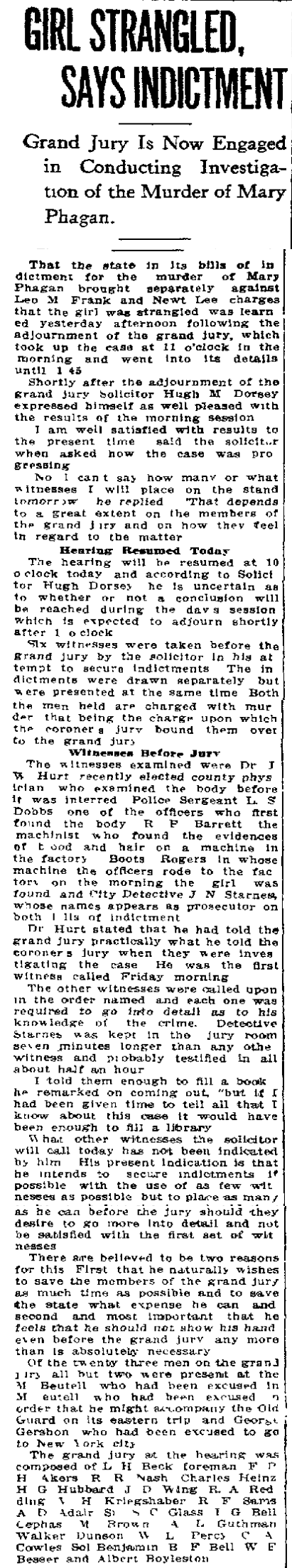 That the state in its bills of indictment for the murder of Mary Phagan, brought separately against Leo M. Frank and Newt Lee, charges that the girl was strangled, was learned yesterday afternoon following the adjournment of the grand jury, which took up the case at 11 o'clock in the morning and went into its details until 1:45.