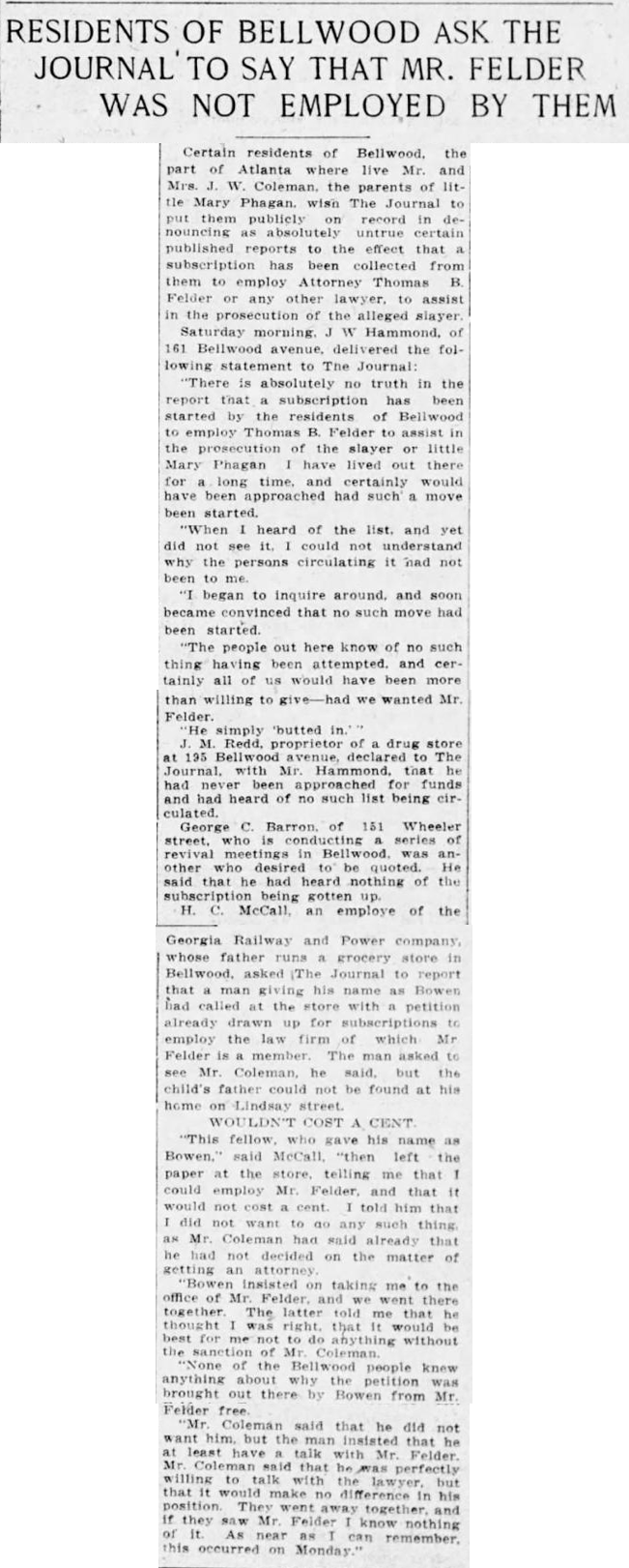Certain residents of Bellwood, the part of Atlanta where live Mr. and Mrs. J. W. Coleman, the parents of little Mary Phagan, wish The Journal to put them publicly on record in denouncing as absolutely untrue certain published reports to the effect that a subscription has been collected from them to employ Attorney Thomas B. Felder or any other lawyer, to assist in the prosecution of the alleged slayer.