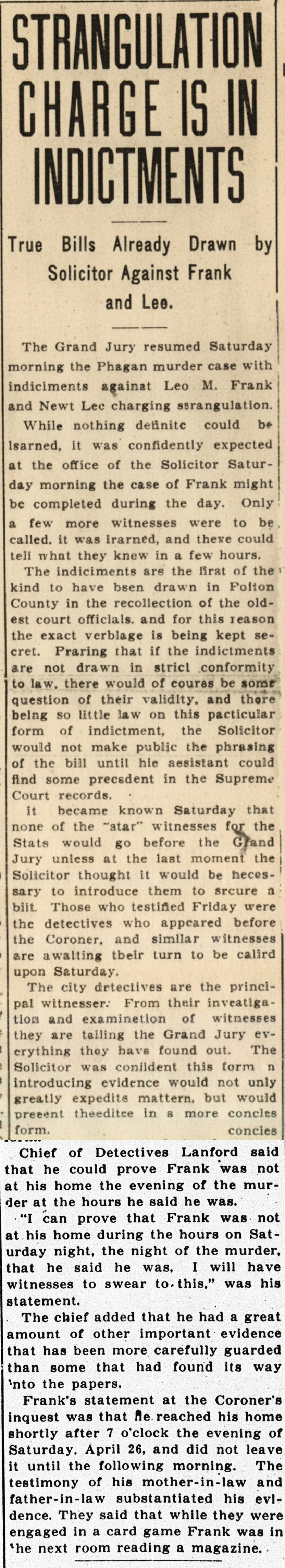 The Grand Jury resumed Saturday morning the Phagan murder case with indictments against Leo M. Frank and Newt Lee charging strangulation.