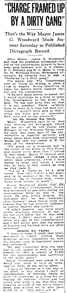 "I'll stand on a drygoods box in the center of the street at Five Points and repeat every word that I uttered in that room," Mayor Woodward said. "There are some things I said and which were eliminated, which I have stated in print, and which I would like to have in that record as long as they have it.