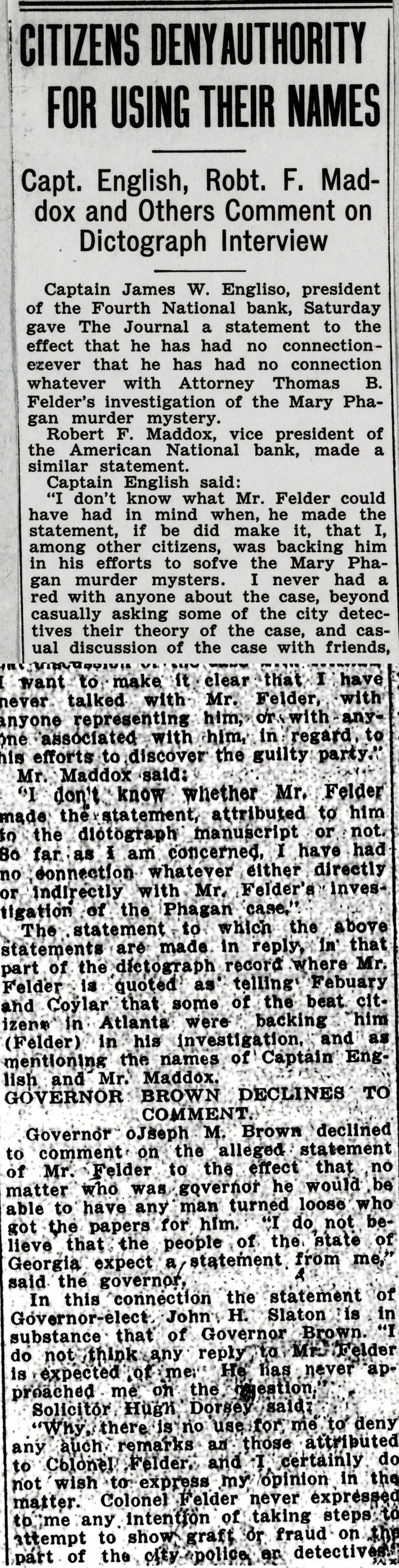 "I don't know what Mr. Felder could have had in mind when he made the statement, if he did make it, that I, among other citizens, was backing him in his efforts to solve the Mary Phagan murder mystery. I never had a conversation with him or with anyone representing him in regard to the Phagan case. In fact, I have not conferred with anyone about the case, beyond casually asking some of the city detectives their theory of the case, and casual discussion of the case with friends. I want to make it clear that I have never talked with Mr. Felder, with anyone representing him, or with anyone associated with him, in regard to his efforts to discover the guilty party."