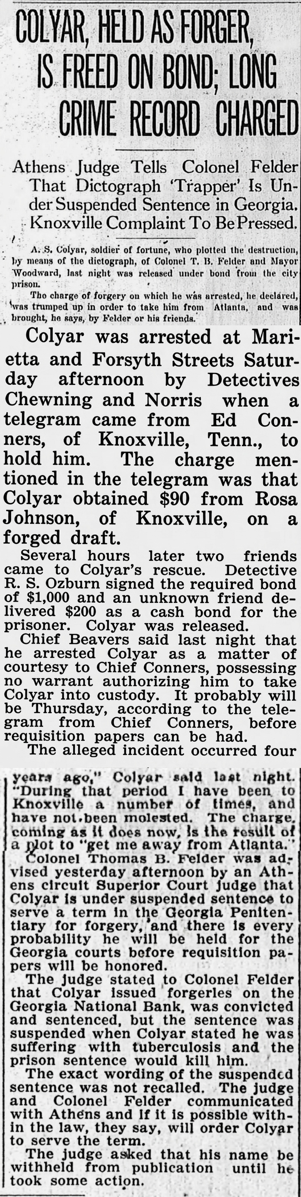 Colyar was arrested at Marietta and Forsyth Streets Saturday afternoon by Detectives Chewning and Norris when a telegram came from Ed Conners, of Knoxville, Tenn., to hold him. The charge mentioned in the telegram was that Colyar obtained $90 from Rosa Johnson, of Knoxville, on a forged draft.