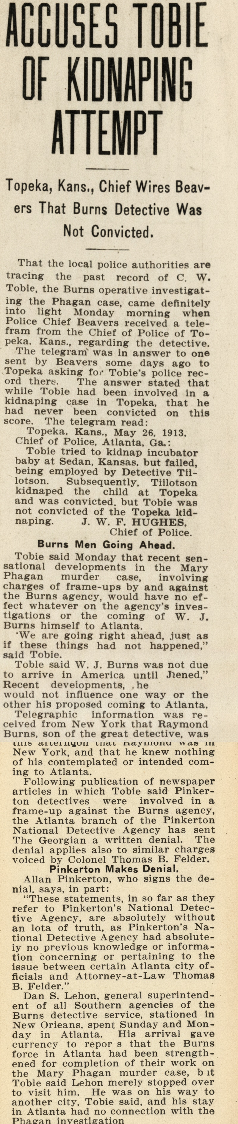Following the publication of newspaper articles in which Tobie said Pinkerton detectives were involved in a frame-up against the Burns agency, the Atlanta branch of the Pinkerton National Detective Agency has sent The Georgian a written denial. The denial applies also to similar charges voiced by Colonel Thomas B. Felder.