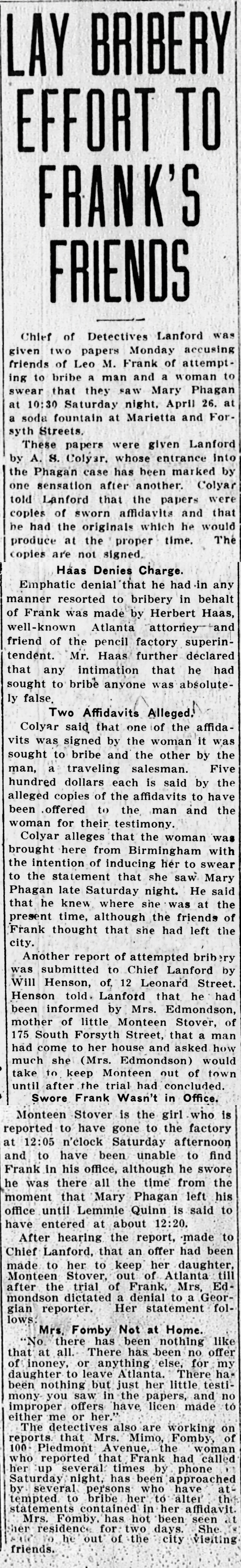 The detectives are also working on reports that Mrs. Mima [sic] Fomby, of 400 Piedmont Avenue, the woman who reported that Frank had called her up several times by phone on Saturday night, has been approached by several persons who have attempted to bribe her to alter the statements contained in her affidavit.